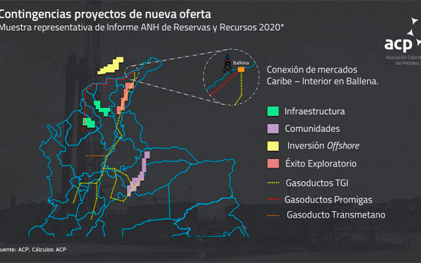 En línea con lo anterior, la Asociación Colombiana del Petróleo y Gas, en conjunto con las empresas productoras de gas, ha identificado proyectos concretos que podrían aportar gas natural adicional al mercado nacional a mediano y largo plazo, correspondientes a recursos tanto en tierra firme como en costa afuera.
