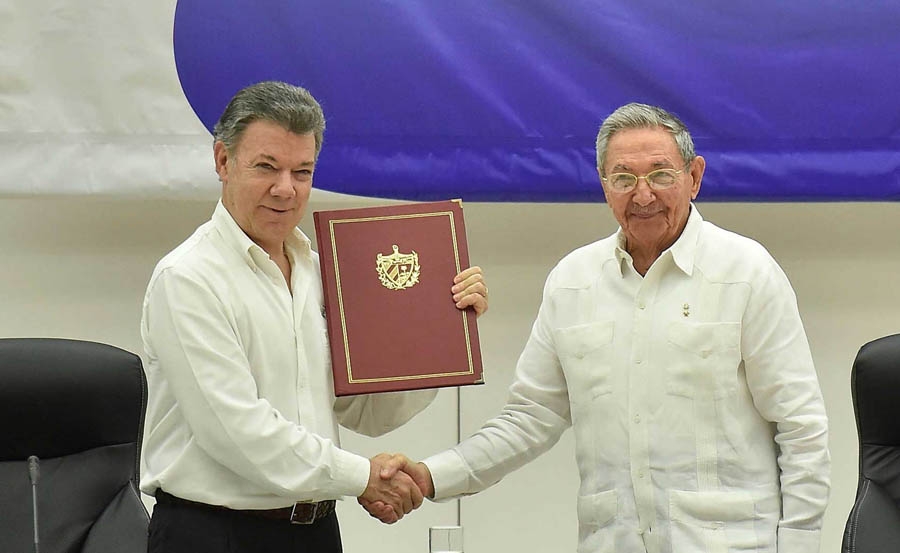 El Jefe de Estado encabezó en La Habana el acto de la firma del Acuerdo para el Cese al Fuego y de Hostilidades Bilateral y Definitivo, y la Dejación de las Armas, con las FARC en presencia del líder de ese grupo, ‘Timoleón Jiménez’, el Secretario de la ONU, Ban Ki-moon; los presidentes de Cuba, Raúl Castro; Chile, Michele Bachelet; México, Enrique Peña Nieto; Venezuela, Nicolás Maduro; República Dominicana, Danilo Medina y El Salvador, Salvador Sánchez Cerén.