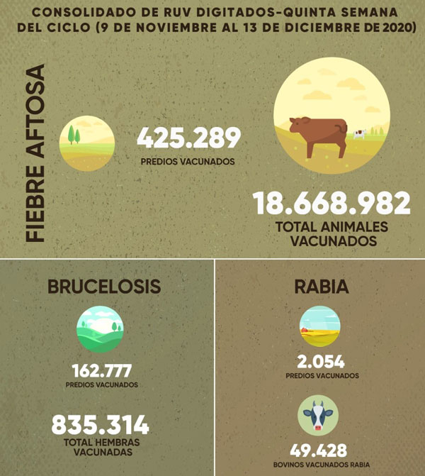 Por su parte José De Silvestri, gerente técnico de Fedegán-FNG, dijo que los resultados son superiores al quinto avance del primer ciclo de vacunación de 2020 y se encuentra dentro de lo programado previamente por la alianza público-privada.