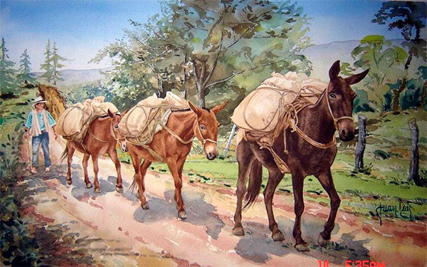 Esas épocas, en veranos voraces y abrazadores, también levantaron polvaredas que formaban nubes de partículas incómodas que dejaban un indeseable talco de piedra en prendas, cabelleras, calzados y alpargatas. Con las frentes como cascadas dejando caer sudor a cántaros, los cargueros y los campesinos iban por caminos primitivos empujando mulas, arreglando cargas o cuando era el caso, transportando en sillas, los viajeros que inauguraban frunciendo el ceño, el primer modo de transporte del lejano período, el de, “a pata”, o a físico espinazo de cristiano.